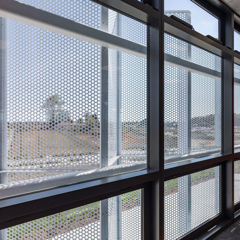 穿孔金屬板廣泛用于外部陽光控制系統。 為此,面板使人們享受舒適的工作環境而不會刺眼的陽光,并保持空氣流入建筑物并調節溫度。 此外,這種采用也為建筑外墻增添了活力。 穿孔金屬防曬霜的最佳選擇材料是鋁或鋁合金。 成品具有很高的強度重量比,即使在長期的陽光照射下也能抵抗老化。
